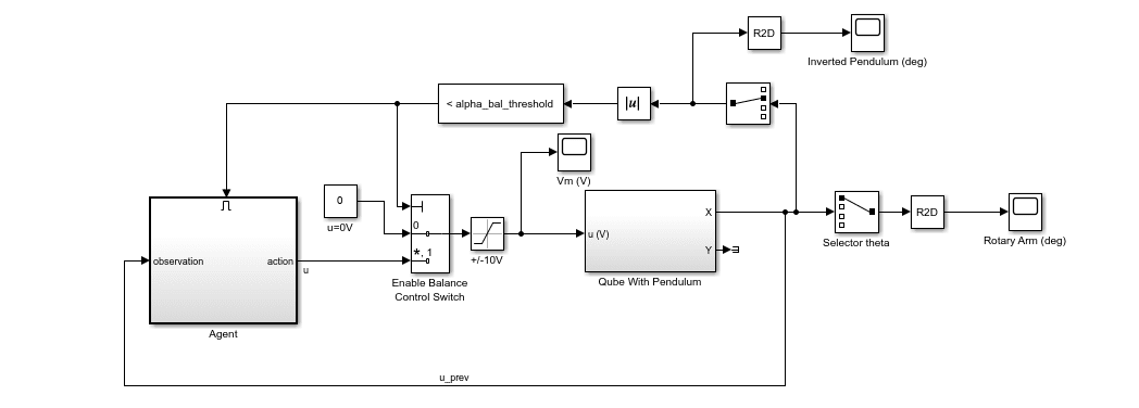 The agent is first tested in the same Simulink model that was used to train the agent, shown in Figure 3. As discussed previously, this Simulink model uses a nonlinear model of the rotary pendulum system.