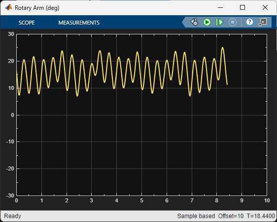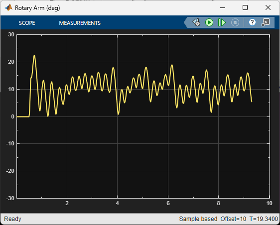 The virtual twin uses a more representative model of the system than the nonlinear model that was used for the training. It incorporates DC motor friction and signal conditioning effects. As a result, the rotary arm tends to oscillate more about balance position which is more in-line with how the hardware behaves when running the balance control. This test provides some validation that the reinforcement learning agent can be realized on the actual hardware.
