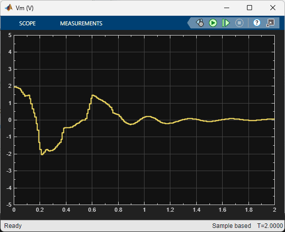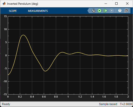 The response of the rotary arm and pendulum when it starts at approximately -7.5 deg from the upright balance position is shown in the Rotary Arm (deg) and Inverted Pendulum (deg) scopes and the corresponding voltage applied to the motor is shown in the Vm (V) scope. As shown in the responses below, the pendulum is balanced quickly (in less than 0.4 sec), similarly as with the LQR-based control, and the control signal is smooth – making it realizable on the virtual twin and hardware.