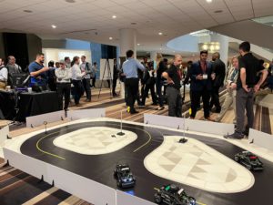 Being our first in person event since the pandemic, we knew we wanted to make a big splash and have compelling demonstrations to foster discussions and interesting applications of our solutions. As the ACC is a highly technical conference, we also wanted to ensure we were showing applications that would connect with the audience. We surveyed the 16 tracks (yes 16!) and found the most common themes to include adaptive control, autonomous systems, control applications, estimation, optimal control and machine learning. With those themes in mind, we configured our demonstrations in a way to cover as many of those themes as possible! Our booth consisted of our latest Self-Driving Car demo that had 3 vehicles (QCars) estimate their position and use distributed control to optimally navigate a course all the while leveraging machine learning to classify road signs and react to them! Flanking the cars was our academic robotic manipulator (QArm) as well as our latest control systems products (Aero 2 and QUBE-Servo 2).