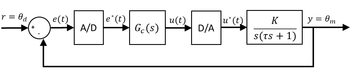 The main difference between a true continuous controller and one implemented on a digital computer is the sampling. The PC/laptop/MCU is connected to a data acquisition (DAQ) device that receives measured sensor signals through the analog-to-digital (A/D) converter and outputs signals through the digital-to-analog (D/A) converter at fixed sampling intervals. The interface between the DAQ and the plant when running a position controller on the QUBE-Servo 2 is shown below.