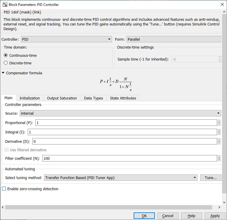 The PID Controller gains are set to the values found using the PID Tuner previously. This was done by just typing in the compensator Transfer Fcn object C that was exported from the tuner.