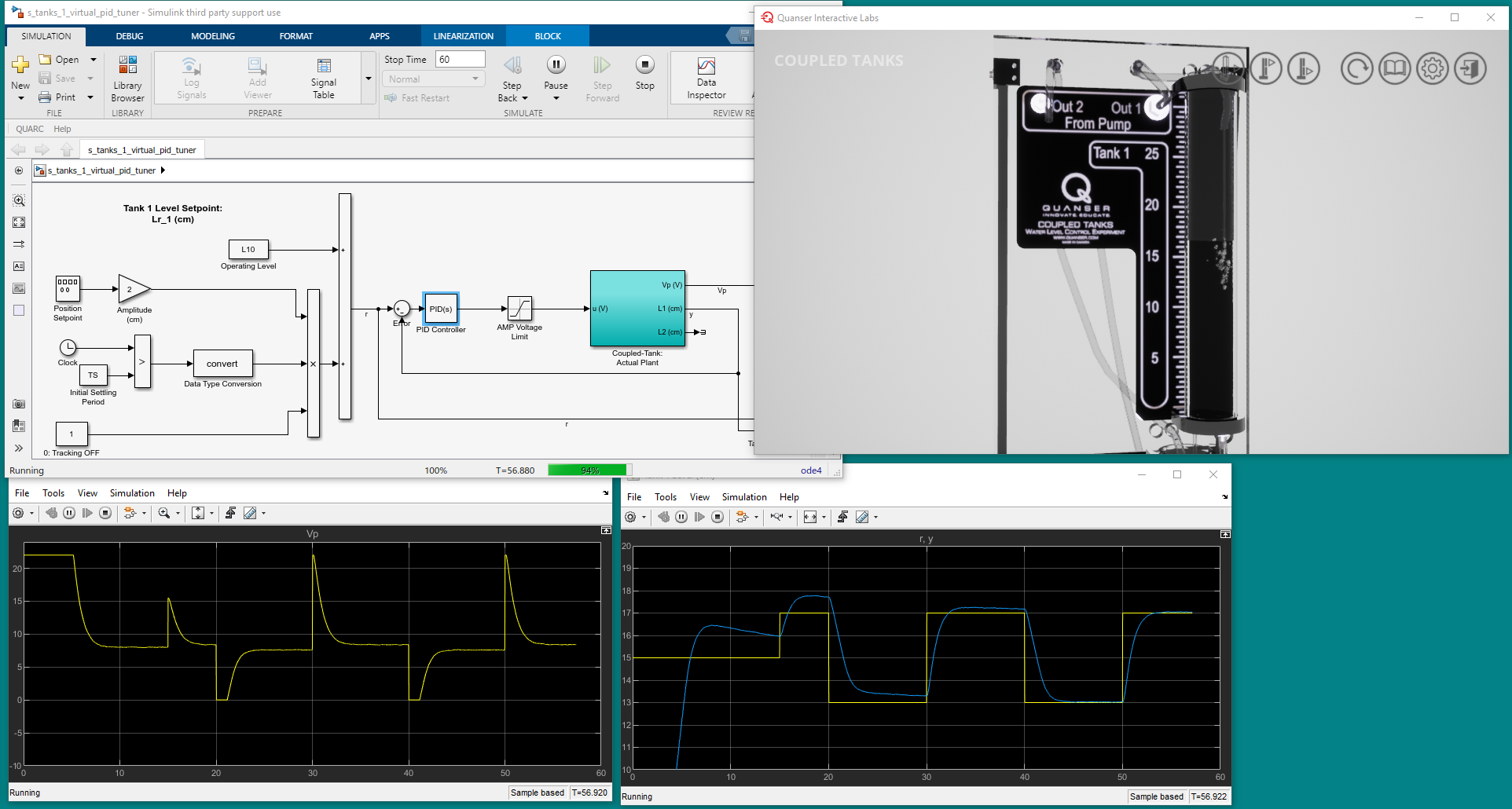 Here’s a summary of the results for the Coupled Tanks simulation using an idealized nonlinear model, the QLabs Coupled Tanks Virtual Experiment, and the actual Quanser Coupled Tanks hardware.