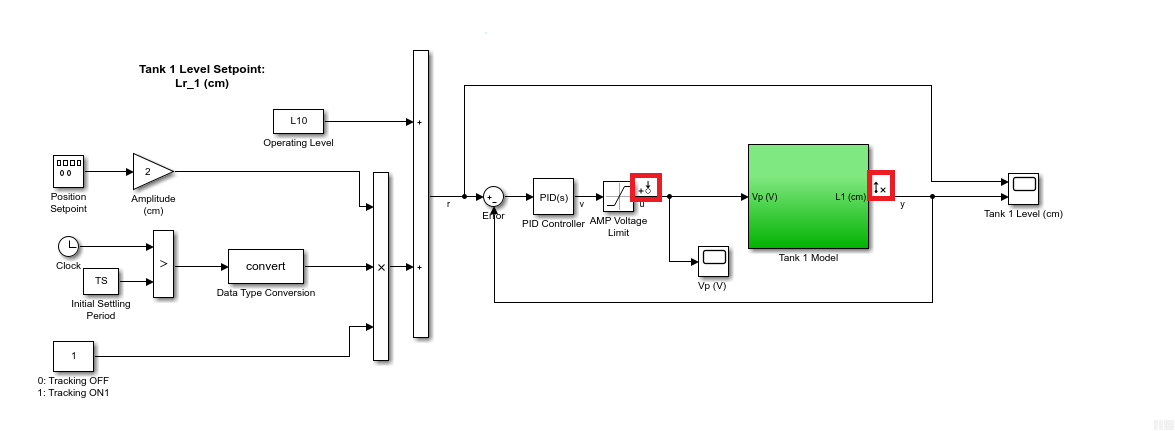 Go back to the Simulink model with the nonlinear model defined, in the Tank 1 Model subsystem, and with the tuned PID gains set in the PID Controller block.