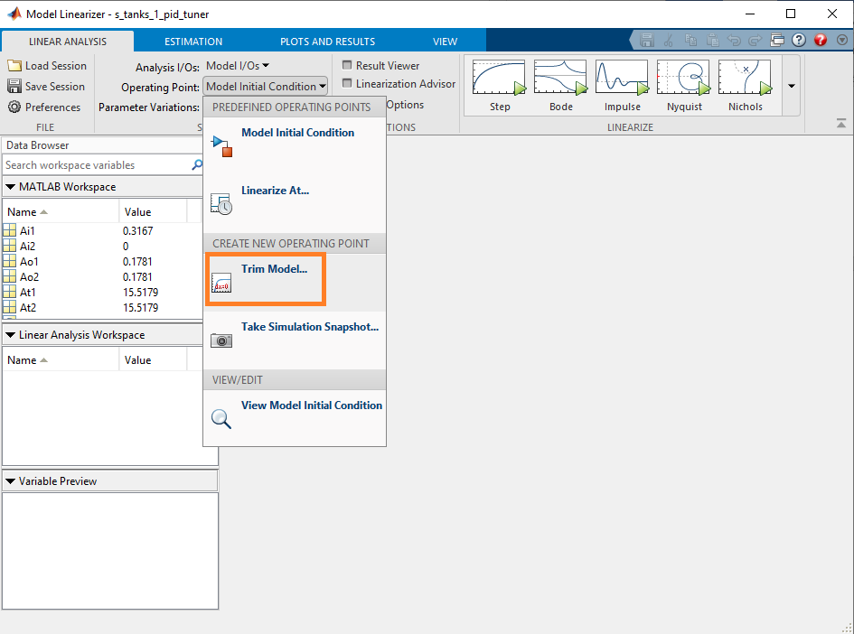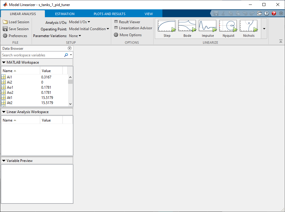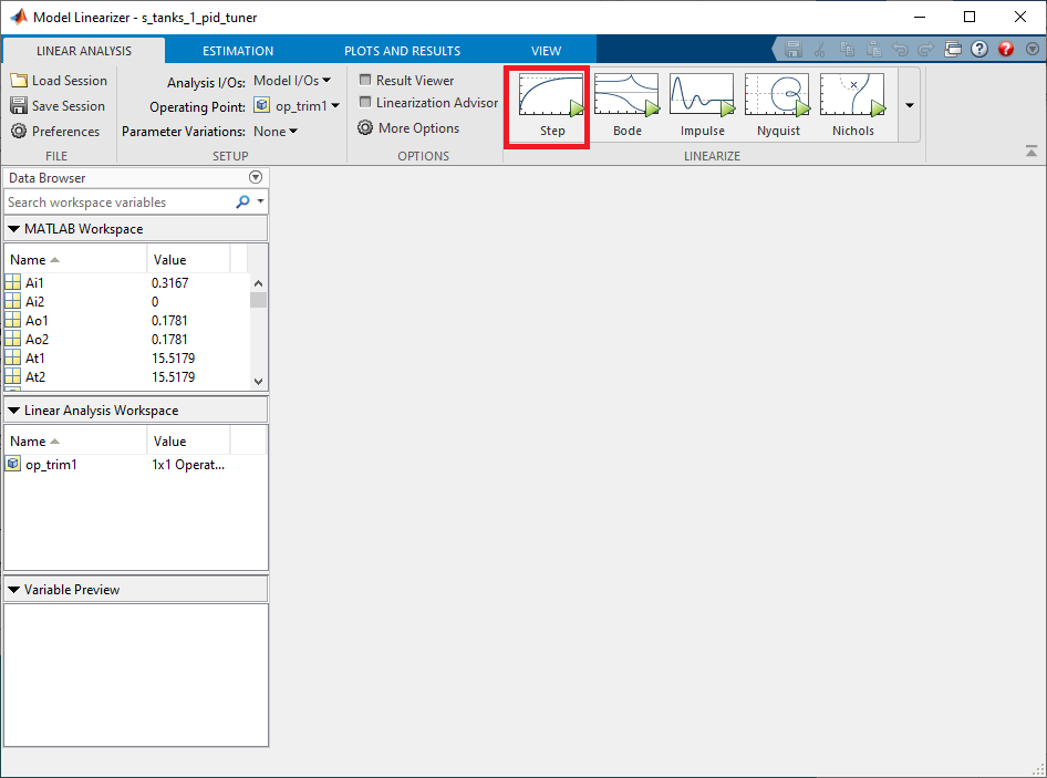 - Now that we have our linear model, we can drag the tanks1_mdl_lin object to the MATLAB Workspace in order for the model to be available to the PID Tuner.