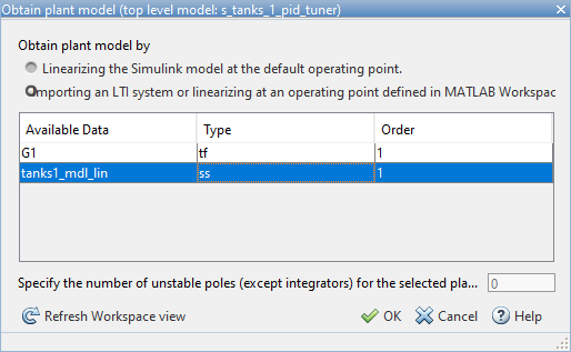 The PID Tuner App uses a linear model to compute the PID gains. The Coupled Tanks is a nonlinear system. Typically, we would linearize the nonlinear model by-hand about a certain operation point, in this case when the tank 1 level is at the 15 cm mark. Instead of doing this manually, we can instead use the Simulink Linearization tools to find the linear model.