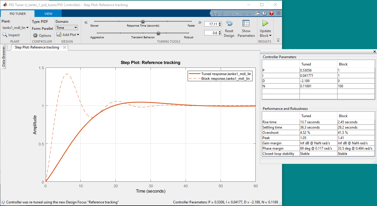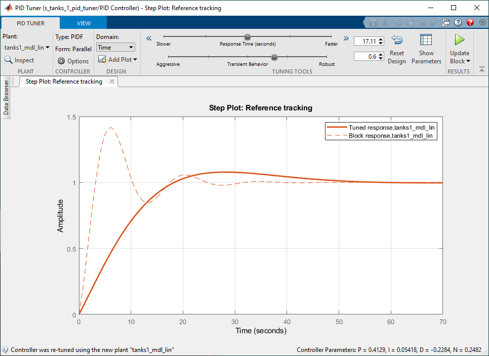 - Based on the linear-model based simulation, the Tuned response complies with our desired specifications. We can now test this again using the nonlinear plant to get a more realistic response at a different operating range. Click on the Update Block button to set the PID Controller block gains in the Simulink model to the tuned ones just found. We can also export this as a MATLAB Transfer Fcn object, e.g. C, in order to use this in other Simulink models.