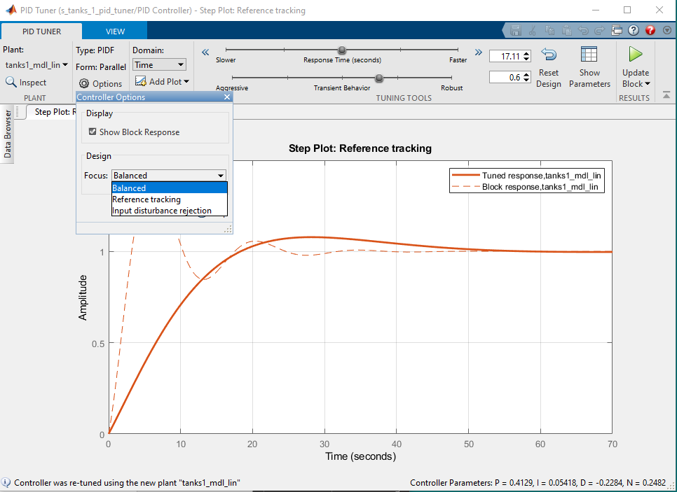 - Click on the Options button. The PID Tuner can be optimized to different design goals: Reference Tracking, Input Disturbance Rejection, or the Balanced approach. Here we select Reference Tracking.