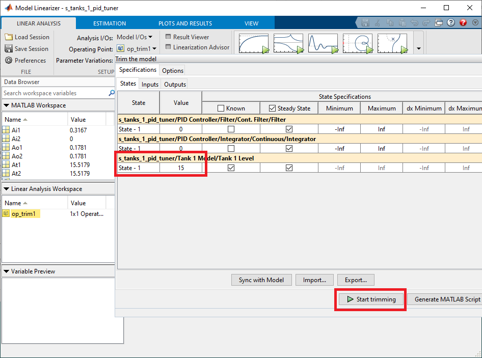- The Analysis I/Os setting is defined as the Model I/Os we have just defined above. The Operating Point needs to be changed because we will be controlling the water level about the 15 cm mark. In order to define this operating point for the linearization, go to Trim Model.