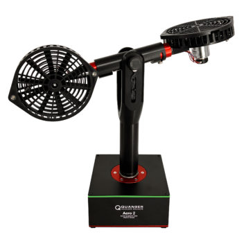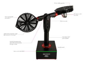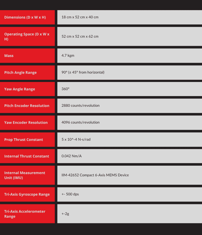 Two rotors provide thrust and allow users to safely control the device’s dynamic response. Interchangeable propellers, user-adjustable thrust vectors, and the ability to lock axes individually mean the Aero 2 is capable of abstracting a variety of aerospace systems, such as half-quadrotor, 1-DOF VTOL, and 2-DOF helicopter.