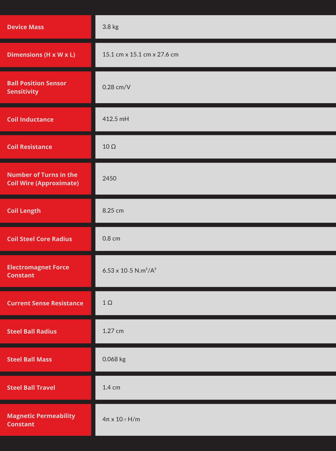 | Electromagnet Force Constant | 6.53 × 10⁻⁵ N·m²/A² |