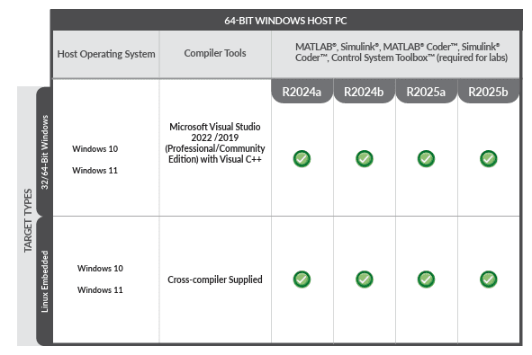 Please check this chart to confirm that the operating system and third-party software installed on your host and target computers comply with requirements of QUARC™ 2025 SP1. This will allow you to successfully install and run the QUARC™ 2025 SP1.