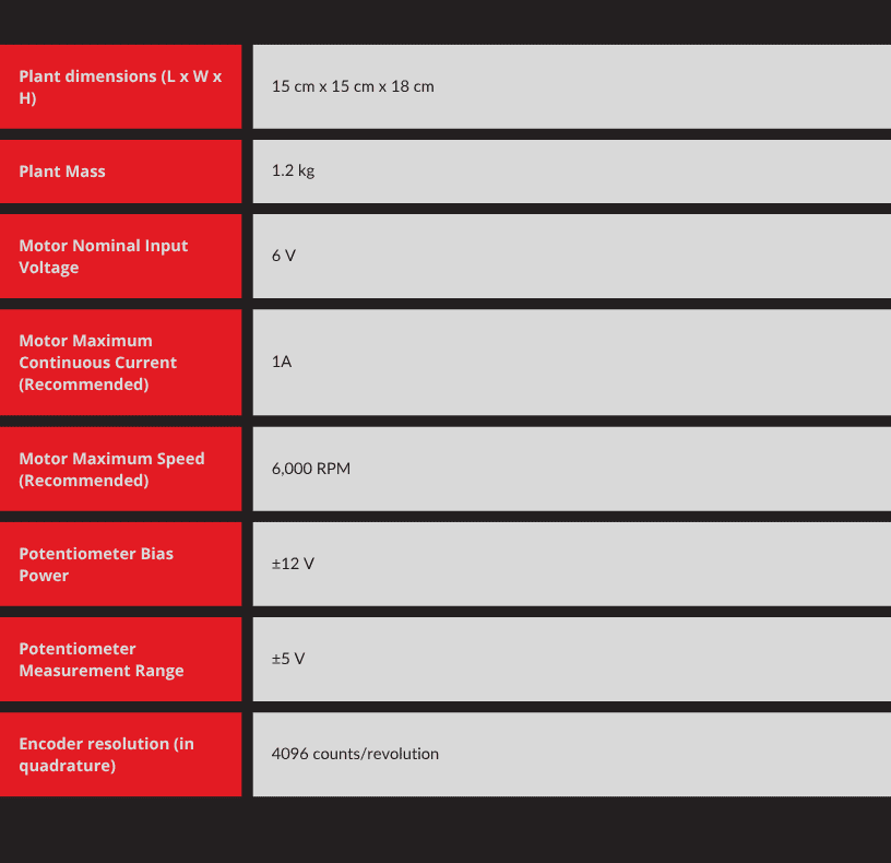 The Rotary Servo Base Unit is the fundamental element of the Quanser Rotary Control family. It is ideally suited to introduce basic control concepts and theories on an easy-to-use and intuitive platform. Use it on its own to perform several experiments or expand the scope of this unit by adding on other modules to teach an even wider range of control concepts. Instructors can thus expose students to a variety of rotary control challenges for a minimal investment. Real-world applications of the rotary servomotor include the autofocus feature in modern cameras, cruise control in automobiles, and servo actuation in aerospace.
